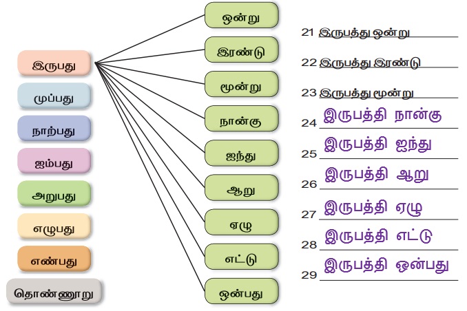 21 இலிருந்து 99 வரை எண் பெயரை எழுதக் கற்போம். முதலில் 21 இலிருந்து 29 வரை எண் பெயரை எழுதுவோம். 21, 22, ... 29 வரை உள்ள எண்களில் 2 பத்துகளும் வெவ்வேறு ஒன்றுகளும் உள்ளன என்பதை அறிவோம். அதாவது, இந்த எண்கள் 20 உடன் 1, 2, 3,... 9 சேர்த்து இவ்வெண்கள் உருவாக்கப்படுகின்றன. எனவே, இவற்றின் எண் பெயரைக் கீழ்க்கண்டவாறு எழுதலாம்.