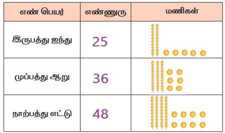 கொடுக்கப்பட்டுள்ள எண் பெயருக்குப் பொருத்தமான எண்களை எழுதி அவற்றின் மணிகளை வரைக.