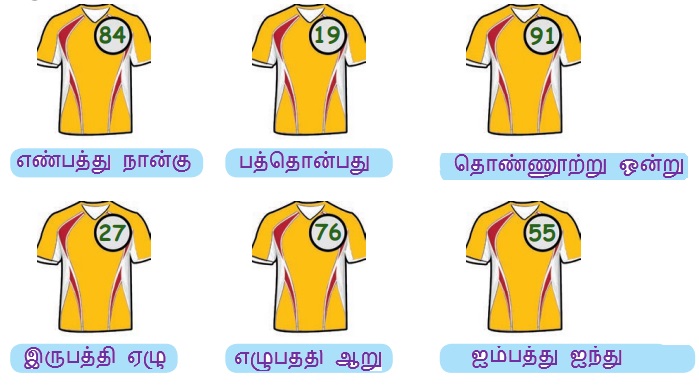 (ii) விளையாட்டுச் சட்டையில் கொடுக்கப்பட்டுள்ள எண்களுக்கு எண் பெயரை எழுதுக.