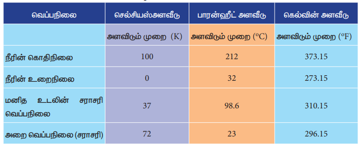 பாரன்ஹீட் அளவீட்டிற்கும் செல்சியஸ் அளவீட்டிற்கும் உள்ள தொடர்பும், கெல்வின் அளவீட்டிற்கும் செல்சியஸ் அளவீட்டிற்கும் உள்ள தொடர்பும் கீழே கொடுக்கப்பட்டுள்ளது.