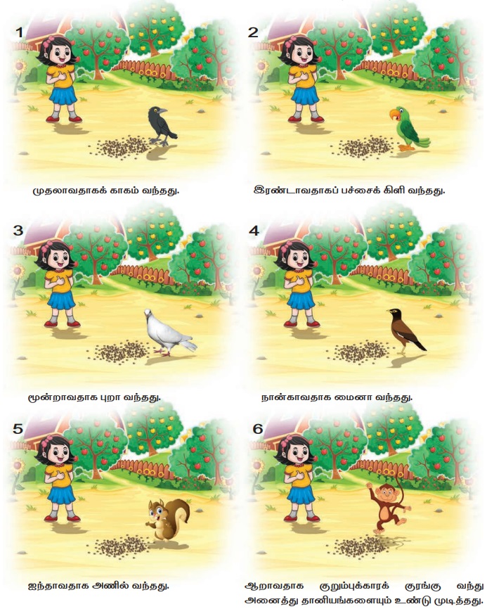 1. முதலாவதாகக் காகம் வந்தது.
