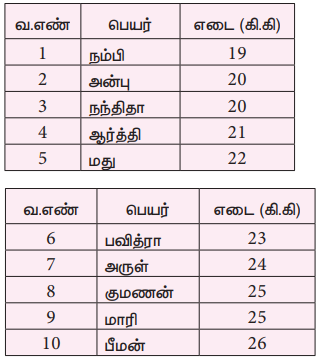 • அன்பு - 20 கிலோ கிராம்; நம்பி - 19 கிலோ கிராம்; நந்திதா - 20 கிலோ கிராம்; அருள் - 24 கிலோ கிராம்; மாரி - 25 கிலோ கிராம்; மது - 22 கிலோ கிராம்; பவித்ரா – 23 கிலோ கிராம்; பீமன் - 26 கிலோ கிராம்; ஆர்த்தி - 21 கிலோ கிராம்; குமணன் – 25 கிலோ கிராம்.
