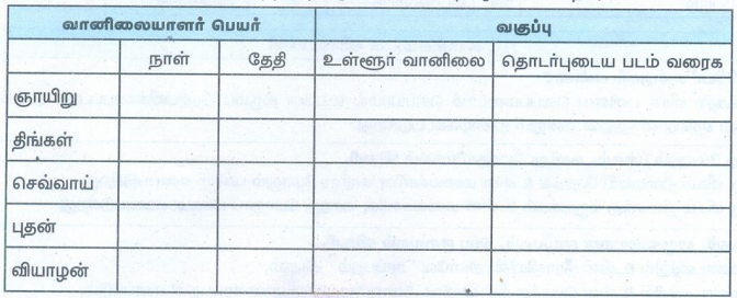 அரும்பும் வானவியலாளராக ஆகுக. தங்கள் பகுதியின் ஒரு வார காலத்தில் நிகழும் வானிலை நிகழ்வுகளை பதிவு செய்க.