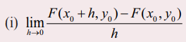 (i) ன் மதிப்பு காணத்தக்கது எனில் (x0 , y0) ∈ A இல் F –க்குx -ஐப் பொருத்த பகுதி வகைக்கெழு உள்ளது எனலாம். இந்த எல்லை மதிப்பு ∂F/∂x (x0 , y0) எனக் குறிக்கப்படும். ... (10)