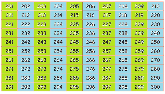 கீழே கொடுக்கப்பட்டுள்ள எண் அட்டவணையை உற்றுநோக்கவும். ஒற்றை எண்களைப் பச்சை நிறத்திலும் இரட்டை எண்களை நீல நிறத்திலும் வண்ணமிடவும்.