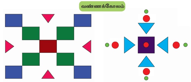 வெவ்வேறு அமைப்பில் வடிவங்களை வரைந்து வண்ணக் கோலம் உருவாக்குக.