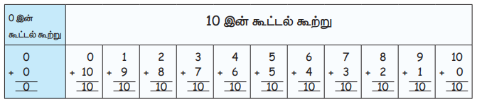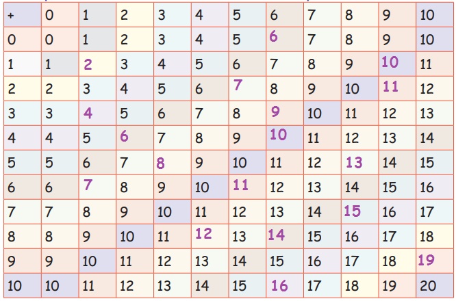 கொடுக்கப்பட்டுள்ள அட்டவணையை உற்று நோக்குக அதில் 10 என்ற எண்ணைக் கூடுதலாகப் பெற பல வழிகள் உள்ளதை உங்களால் வரை முடியும்