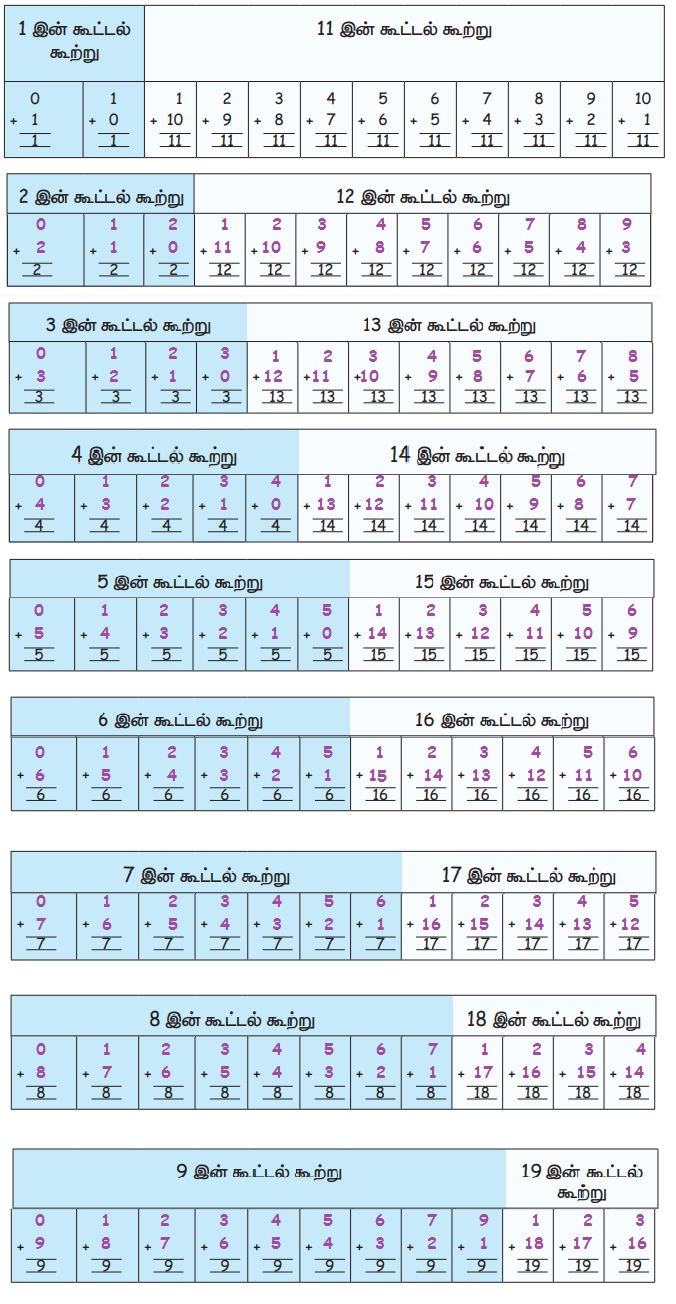 1. கூட்டல் அட்டவணையை நிறைவு செய்து அவற்றில் உள்ள அமைப்பினை உற்று நோக்குக