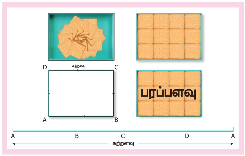 அபூர்வாவும் அவளது அண்ணனும் பள்ளியிலிருந்து திரும்புகிறார்கள். அவளது அம்மா அவர்களுக்குச்சில பிஸ்கட்டுகளைத் தருகிறார். அவர்கள் அவற்றை ஒவ்வொன்றாக உண்ணும்போது, அபூர்வா பிஸ்கட்டுகளைத் தட்டின் மீது அடுக்கி விளையாடுகிறாள். அப்போது தட்டில் 12 பிஸ்கட்டுகளை மட்டும் அடுக்க முடிவதைக் கவனிக்கிறாள். அவள் அவ்வாறே பிஸ்கட்டுகளைத் தொடர்ந்து அடுக்க வேண்டும் எனில் அவளுக்கு இதை விட ஒரு பெரிய தட்டு தேவைப்படுகிறது. ஏனெனில் தட்டின் மேற்பகுதி முழுவதும் 12 பிஸ்கட்டுகளால் நிரம்பி விட்டது. கண்ணிற்குப் புலப்படும் விளிம்புகளின் மொத்த நீளம் அத்தட்டின் சுற்றளவு எனவும் பிஸ்கட்டுகளால் நிரப்பப்பட்ட தட்டின் மேற்பகுதி தட்டின் பரப்பளவு எனவும் அழைக்கப்படுகின்றன. சுற்றளவு மற்றும் பரப்பளவு குறித்து இந்த இயலில் விரிவாகக் கற்போம்.