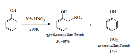பீனால் அறை வெப்பநிலையில் 20% நைட்ரிக் அமிலத்துடன் வினைப்பட்டு ஆர்த்தோ மற்றும் பாரா நைட்ரோ பீனால் கலவைகளை தருகிறது.