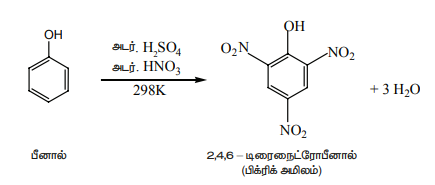 அடர் HNO3 + அடர் H2SO4 உடன் பீனால் நைட்ரோ ஏற்றம் அடைந்து பிக்ரிக் அமிலத்தை தருகிறது.