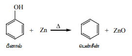 பீனால் Zn தூளுடன் வினைப்படுத்தும் போது பென்சீன் கிடைக்கிறது. இவ்வினையில் அரோமேட்டிக் வளையத்தில் உள்ள - OH தொகுதி நீக்கப்படுகிறது.