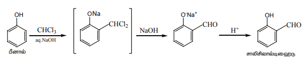 CHCl3/NaOH, முன்னிலையில் ஒரு-CHO உடன் பீனால் வினைப்படும் போது ஆர்த்தோ இடத்தில் - CHO தொகுதி இடம் பெறுகிறது. இவ்வினையானது பதிலீடு செய்யப்பட்ட பென்சால் குளோரைடு எனும் இடைநிலை பொருள் மூலமாக நடைபெறுகிறது.
