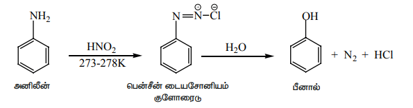 அனிலீனை 273 - 278K வெப்பநிலையில் நைட்ரஸ் அமிலத்துடன் (NaNO2 HCl) டயசோ ஆக்கலுக்கு உட்படுத்தும் போது முதலில் பென்சீன் டயசோனியம் குளோரைடு கிடைக்கிறது. இதனை கனிம அமில முன்னிலையில் சூடான நீருடன் வினைப்படுத்தும் போது பீனால் கிடைக்கிறது.