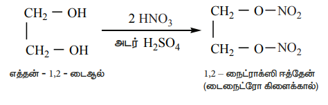 அடர் கந்தக அமிலத்தின் முன்னிலையில் அடர் HNO3 உடன் வெப்பப்படுத்தும் போது, எத்திலீன் கிளைக்கால் டை நைட்ரோ கிளைக்காலைத் தருகிறது.