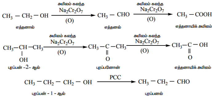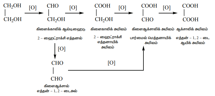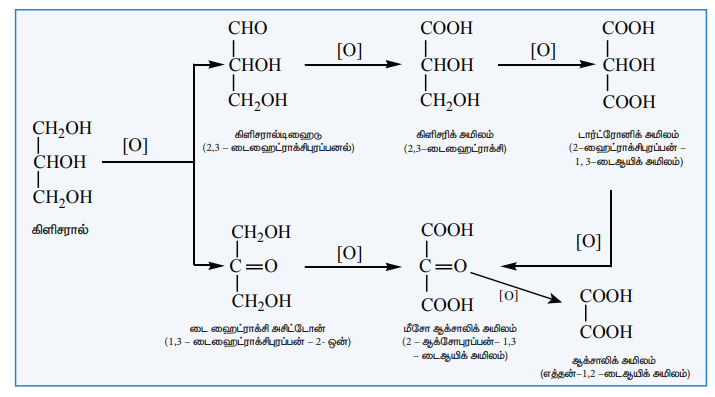 ஊ) அமிலம் கலந்த KMnO4 ஐ பயன்படுத்தி ஆக்சிஜனேற்றம் அடையச் செய்யும் போது கிளிசரால் ஆக்சாலிக் அமிலத்தை தருகிறது.