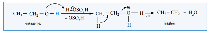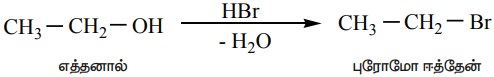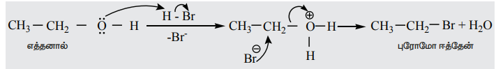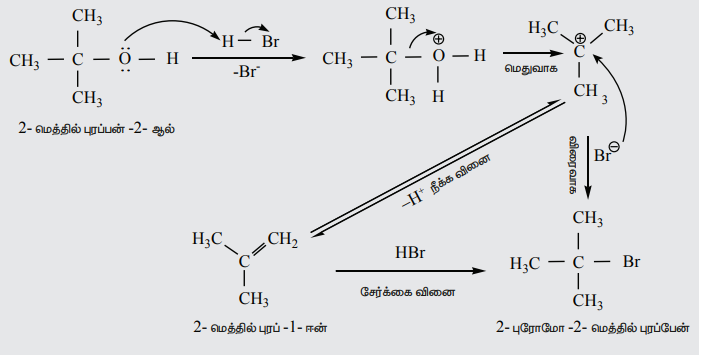 Br- கருக்கவர் பொருள்தாக்குதல் மற்றும் H2O நீங்குதல் ஆகிய இரண்டும் ஒரே நேரத்தில் நிகழ்கின்றன.