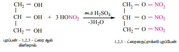 நைட்ரோ ஏற்றம் : கிளிசரால், கந்தக அமிலத்தின் முன்னிலையில் நைட்ரிக் அமிலத்துடன் வினைபுரிந்து TNG (ட்ரைநைட்ரோகிளிசரின்) தருகிறது.