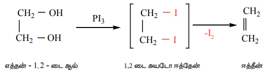 எத்தலீன் கிளைக்காலை HI அல்லது P/I2, உடன் வினைபடுத்தும் போது 1,2 - டை அயேடோ ஈத்தேன் முதலில் உருவாகிறது. இது சிதைவடைந்து ஈத்தீனைத் தருகிறது.