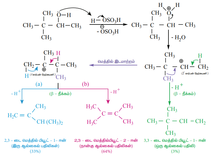 எடுத்துக்காட்டாக, 3,3 - டை மெத்தில் -2- பியூட்டனாலின் நீரகற்றும் வினையில் ஆல்கீன்களின் கலவை உருவாகிறது. இவ்வினையில் உருவாகும் ஈரிணைய கார்பன் நேர் அயனி வடிவமைவு மாற்றத்திற்கு (Rearrangement) உட்பட்டு அதிக நிலைப்புத் தன்மை உடைய மூவிணைய கார்பன் நேர் அயனியைத் தருகிறது.
