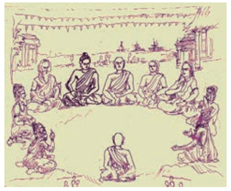 குளிர்ந்த மணல் பரப்பிய பந்தல்களிலும் மரங்கள் தாழ்ந்து நிழல்தரும் ஊர் மன்றங்களிலும் நல்லன பற்றிச் சொற்பொழிவாற்றுங்கள். அவரவர் சமயத்திற்கு உரிய உட்பொருளறிந்து வாதிடுவோர் பட்டிமண்டப முறைகளைத் தெரிந்து வாதிட்டுத் தீர்வு காணுங்கள்