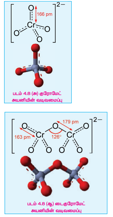 அயனியின் வடிவமைப்பு குரோமேட்மற்றும் டைகுரோமேட் ஆகிய இரண்டும் குரோமியத்தின் ஆக்சோநேர் அயனிகளாகும். மேலும் இவைகள் வலிமையான ஆக்சிஜனேற்ற காரணிகளாகும். இவ்வயனிகளில் குரோமியம் +6 ஆக்சிஜனேற்ற நிலையில் காணப்படுகிறது. நீர்க்கரைசலில் குரோமேட் மற்றும் டைகுரோமேட் அயனிகள் ஒன்றிலிருந்து மற்றொன்றாக மாற்றமடையும் இயல்பினைக் கொண்டுள்ளன. காரக் கரைசலில் குரோமேட் அயனியும் அமிலக் கரைசலில் டைகுரோமேட் அயனியும் முக்கியத்துவம் பெறுகின்றன. இவ்வயனிகளின் வடிவமைப்புகள் மேலே கண்டுள்ள படத்தில் கொடுக்கப்பட்டுள்ளன.