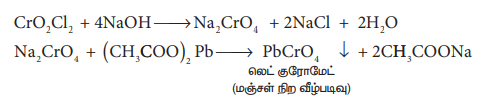 வெளியேறும் குரோமைல் குளோரைடு ஆவியானது சோடியம் ஹைட்ராக்சைடு கரைசலில் கரைக்கப்படுகிறது. பின் இதனுடன் அசிட்டிக் அமிலம் சேர்த்து கரைசலை அமிலத்தன்மை பெறச்செய்து பின் லெட் அசிட்டேட் கரைசலைச் சேர்க்கும்போது, மஞ்சள் நிற லெட் குரோமேட் வீழ்படிவு உருவாகிறது.