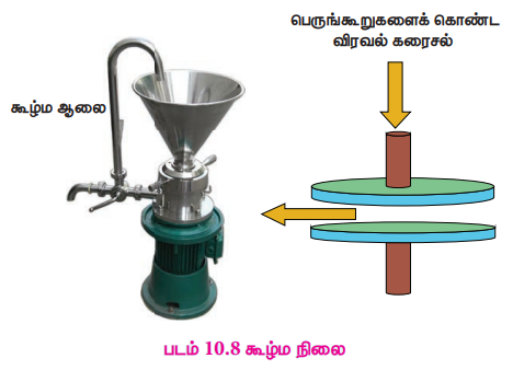 கூழ்ம ஆலையை பயன்படுத்தி, திண்மங்கள் கூழ்மத்துகள் அளவிற்கு அரைக்கப்படுகின்றன. இந்த கூழ்மஆலையில் எதிரெதிர் திசைகளில், அதிவேகத்தில், ஏறத்தாழ ஒரு நிமிடத்தில் 7000 சுழற்சிகள்வரை சுழலும் உலோக தட்டுக்கள் வைக்கப்பட்டுள்ளன.