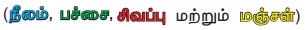 வண்ணங்ளில். ( நீலம், பச்சை, சிவப்பு, மற்றும் மஞ்சள்)