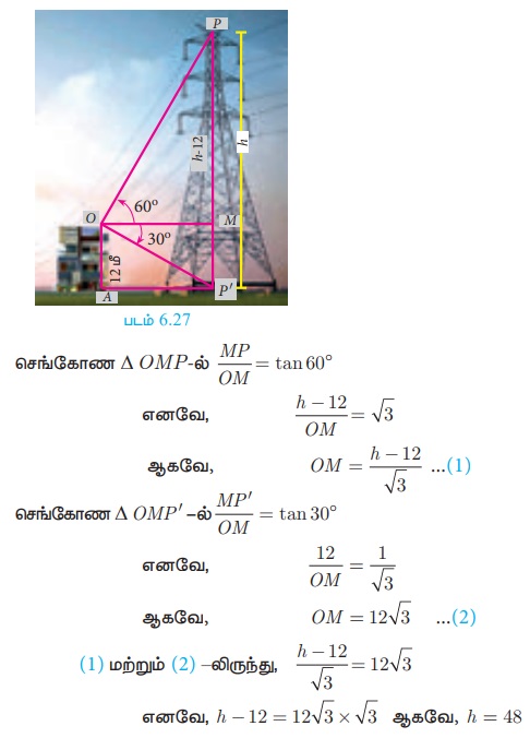 12 மீ உயரமுள்ள கட்டிடத்தின் உச்சியிலிருந்து மின்சாரக் கோபுர உச்சியின் ஏற்றக்கோணம் 60° மற்றும் அதன் அடியின் இறக்கக் கோணம் 30° எனில், மின்சாரக் கோபுரத்தின் உயரத்தைக் காண்க