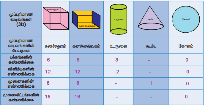 2. கொடுக்கப்பட்டுள்ள முப்பரிமாண வடிவங்களின் பக்கங்களையும், முனைகளையும் மூலைவிட்டங்களையும் எண்ணி எழுதி அட்டவணையை நிரப்புக.