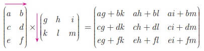 3 × 3 மற்றும் 3 × 2 என்ற அணிகளின் பெருக்கற்பலனை எடுத்துக்கொள்க.