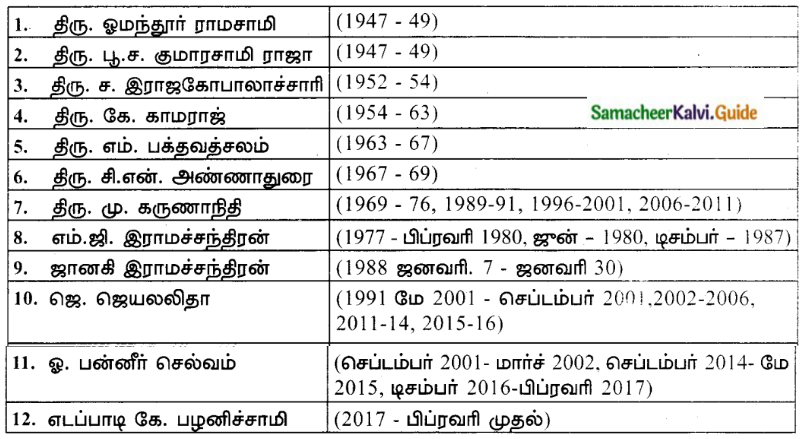 1. தமிழக முதலமைச்சர்களின் பெயர்களைப் பட்டியலிடுக.
