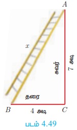 ஏணியின் நீளம் AB = x என்க BC = 4 அடி, AC = 7 அடி.