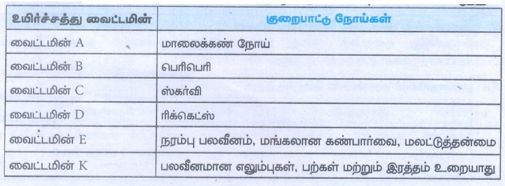 அவற்றின் குறைப்பாட்டால் ஏற்படும் நோய்களகளை யும் அட்டவணைப்படுத்துக