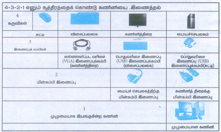 கீழே கொடுக்கப்பட்டுள்ள 4- 3- 2- 1 எனும் சூத்திரத்தை பயன்படுத்தி கணினியின் பாகங்களை