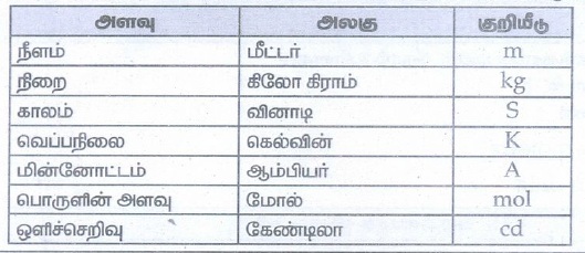அளவுகளை அவற்றின் அலகுகளுடன் பட்டியலிடுக.