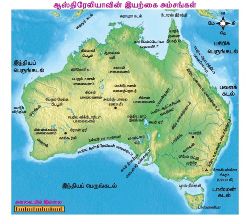 ஆஸ்திரேலியா: பெரிய பிரிவு மலைத்தொடர், பெரிய பவளத் திட்டு, பிளவுப் பள்ளத்தாக்கு, டாஸ்மேனியா, மகரரேகை, பசிபிக் பெருங்கடல், பெரிய ஆஸ்திரேலிய மணல் பாலைவனம், இந்தியப் பெருங்கடல், சிட்னி, கான்பெரா.