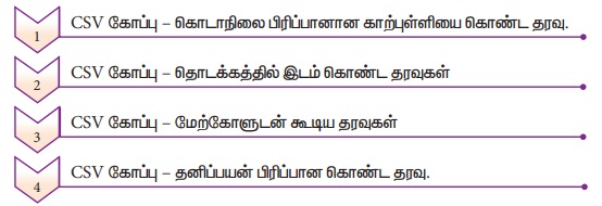 CSV என்ற செயற்கூற்றை வழங்கியுள்ளது. CSV கோப்பிலிருந்து அல்லது CSV கோப்பில் தரவினை