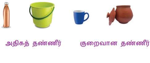 தண்ணீர் நிரபப்பட்ட சில பாத்திரங்கள் இங்கு கொடுக்கப்பட்டுள்ளன. அவற்றை உற்றுநோக்கி எதில் அதிகத் தண்ணீர் உள்ளது எனவும், எதில் குறைவான தண்ணீர் உள்ளது எனவும் கூறுக.