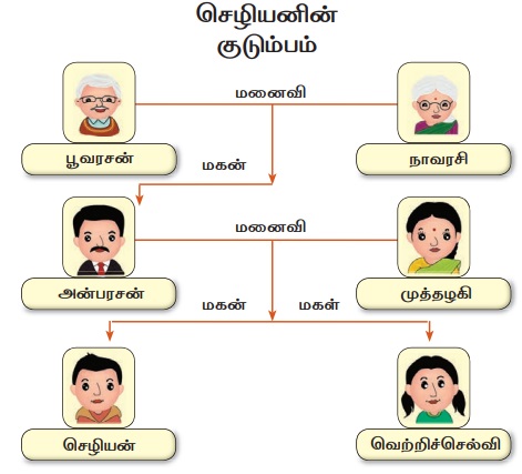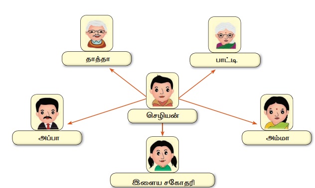 உங்கள் குடும்ப வரைபடத்தை வரைந்து குடும்ப உறுப்பினர்களின் பெயரையும் வயதையும் அதில் குறிப்பிட்டு பின்வரும் வினாக்களுக்கு விடையளிக்கவும்.
