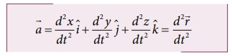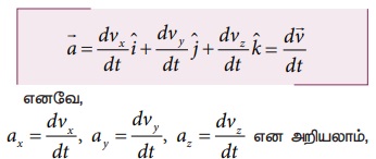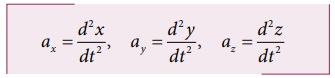 திசைவேகத்தின் அனைத்து கூறுகளும், அதற்குத் தொடர்புடைய ஆய அச்சுக் கூறுகளின் வகைக்கெழுக்களாகும். இதே போன்று முடுக்க வெக்டர் ax, ay, மற்றும் az, ஆகியவற்றை கீழ்க்கண்டவாறு எழுதலாம்.