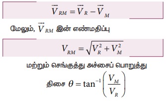 9 + vr = 12 (அல்லது) vr = 3 km h-1 நீச்சல் வீரர் ஆற்று நீரோட்டம் பாய்ந்து கொண்டிருக்கும் அதே திசையில் நீந்தும் போது அவரின் தொகுபயன் திசைவேகம் 12 kmh-1