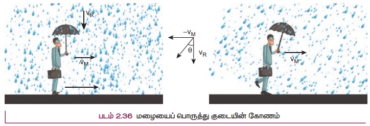திசைவேகத்தில் மழை பொழிகிறது எனில், மனிதரைப் பொருத்து, மழையின் சார்புத் திசைவேகம் (படம் 2.36)