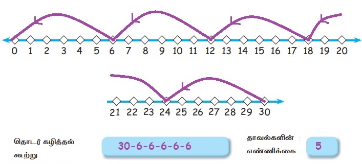 தவளை 0 ஐ அடையத் தாவும் நிலைகளை வளைகோடுகளால் வரைந்து காட்டவும். தொடர் கழித்தல் கூற்றுகள் மற்றும் தாவல்களின் எண்ணிக்கையை எழுதுக.