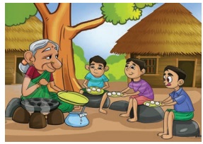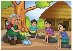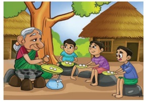 பாட்டி : கவலைப்படாதீர்கள் குழந்தைகளே ! நான் பணியாரங்களை உங்களுக்குச் சமமாகப் பங்கிட்டுக் கொடுக்கின்றேன்.
