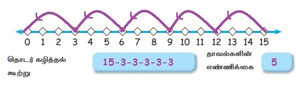 எனவே 9 – 3 = 6, 6 – 3 = 3, 3 – 3 = 0. ஒன்பதிலிருந்து மூன்று, மூன்று பணியாரங்களாக 3 முறை எடுக்கலாம். ஒவ்வொரு குழந்தையும் 3 பணியாரங்கள் பெற்றுள்ளனர்.