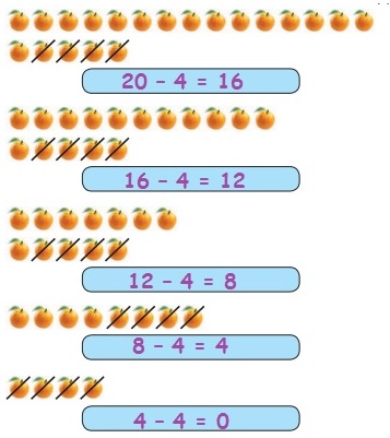 நாம் 20 இலிருந்து 5 ஐ நான்கு முறை தொடர்ந்து கழிக்கலாம்.