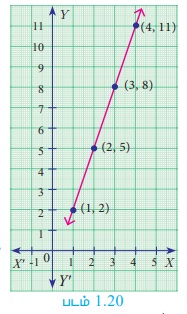 படம் 1.20-ல் உள்ள X Y- தளத்தில் ஒரே நேர்கோட்டில் (1,2), (2,5), (3,8), (4,11) ஆகிய புள்ளிகள் குறிக்கப்பட்டுள்ளன.