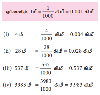 ஏனெனில், 1 மீ = 1 / 1000 கி.மீ = 0.001 கி.மீ